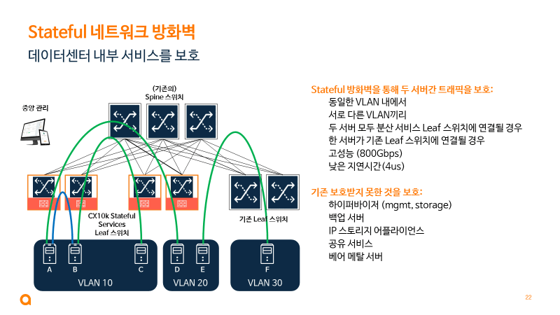 인프라를 관리하고 운영하는 팀은 CX10000 스위치를 사용하여 네트워크와 보안 서비스, 그리고 Layer 4부터 Layer 7 서비스를 어디에서나 사용할 수 있도록 하는 분산 서비스 패브릭을 생성할 수 있습니다.