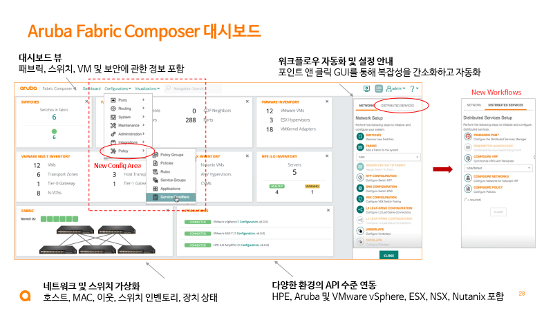 스위치에 대한 관리도 비슷합니다. Aruba Fabric Composer 솔루션을 통해 간단하게 프로비저닝하고 관리할 수 있습니다.