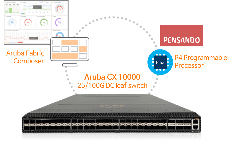 ArubaCX 10000 스위치는 Aruba의 동급 최고의 데이터센터 스위칭과 프로그래밍 가능한 DPU(Data Processing Unit, 데이터 처리 장치)인 Pensando Elba 칩셋을 결합하였습니다.