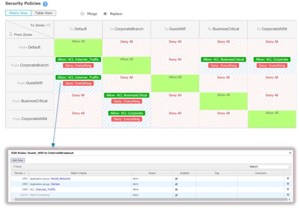 공격 범위를 줄이고 사이버 공격의 확산을 제한하기 위해서 Aruba EdgeConnect SD-WAN은 정책과 애플리케이션을 기반으로 세부적으로 나눌 수 있는 Zone 기반의 방화벽을 사용합니다.