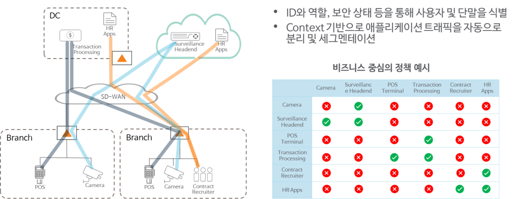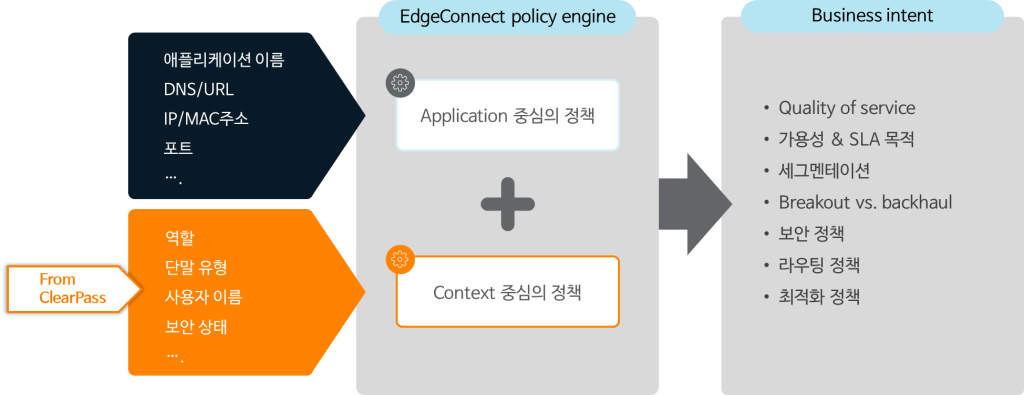 그 뿐만 아니라, Aruba ClearPass와 EdgeConnect간의 서로 연계 및 통합은 RADIUS, TACACS+, OAuth2와 같은 인증 기능과 함께 사용자 및 장치, 역할에 대한 ID 지식을 추가하여 세분화된 마이크로세그멘테이션을 가능하게 합니다.