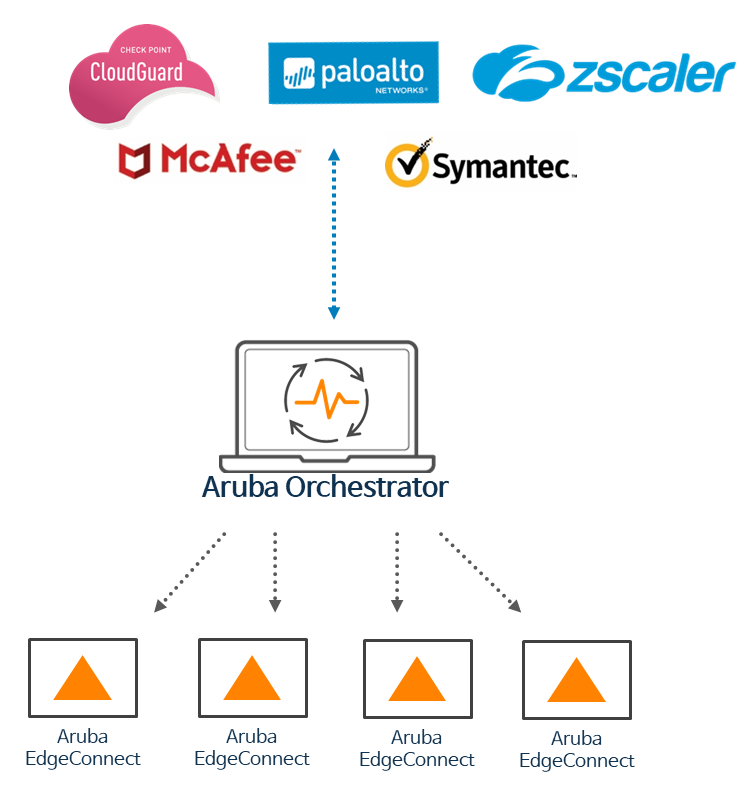 Aruba EdgeConnect는 동급 최고의 타사 클라우드 보안 업체들과 긴밀하게 연계하여 통합하고 오케스트레이션을 자동화하여 업계 최고의 SASE 아키텍처를 위한 기본 구성요소입니다.
