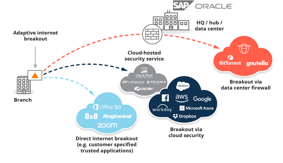또한 보안 로컬 인터넷 브레이크아웃을 사용하여 트래픽을 데이터센터, 클라우드 또는 업계 최고의 클라우드 제공 보안 업체의 서비스로 여러 역할이나 특성, 정책에 따라 지능적으로 라우팅하도록 지원합니다.