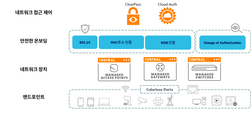 Aruba는 업계 최고의 네트워크 액세스 제어 솔루션인 ClearPass를 사용하여 150개가 넘는 보안 파트너십(Aruba 360 Security Exchange 프로그램의 일부)과 함께 네트워크의 모든 엔드포인트가 원하는 보안 수준을 갖추도록 할 수 있습니다. ClearPass는 보안 요구 사항을 충족하지 못하거나 해당 역할에 맞지 않는 동작을 시도하는 모든 장치에 대한 접근을 제한하거나 인증을 취소할 수 있습니다.