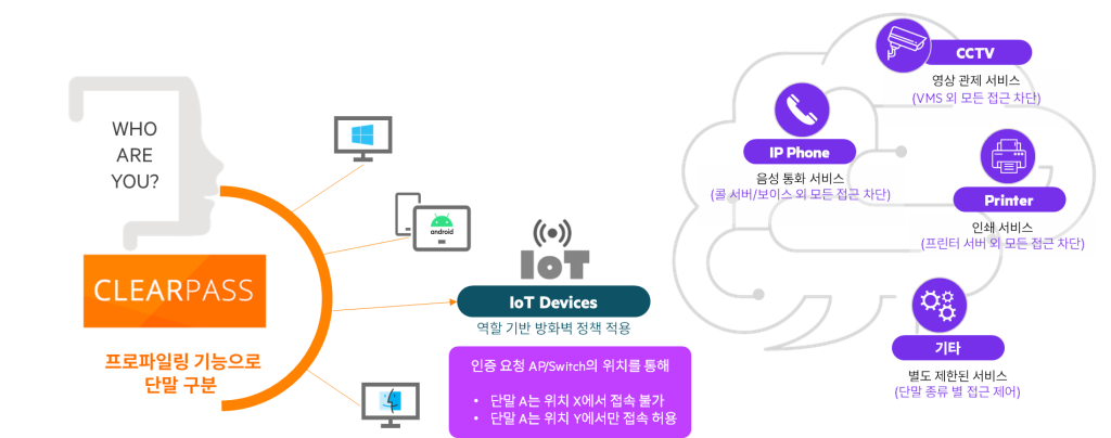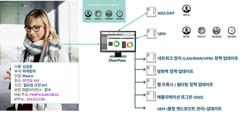 - [자동 정책 변경] HPE Aruba의 ClearPass Policy Manager가 이 변경 사항을 즉시 감지하고, 해당 직원의 노트북 접속이 끊어지거나 위치가 바뀌지 않아도, 네트워크 접근 권한을 자동으로 ‘영업팀 직원’의 정책으로 업데이트합니다.
