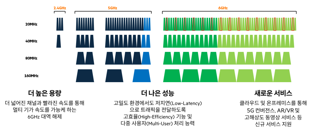 하지만 이미 많은 무선 네트워크가 IoT, 비디오, 디바이스 밀도 증가에 따라 확장되고 있으며, 이제 국가에 따라 500~1200MHz의 깨끗한 새 스펙트럼과 고화질 비디오와 같은 고대역폭, 저지연 앱에 이상적인 더 넓은 80/160MHz의 이점을 누릴 수 있습니다.