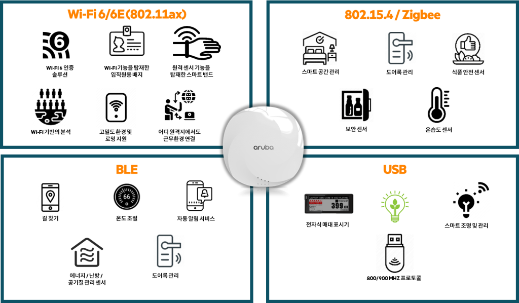 IoT에 초점을 맞춘 AP는 BLE, 802.14.5/Zigbee, USB 포트 확장은 물론 강력한 IoT 파트너 에코시스템을 지원해야 합니다.