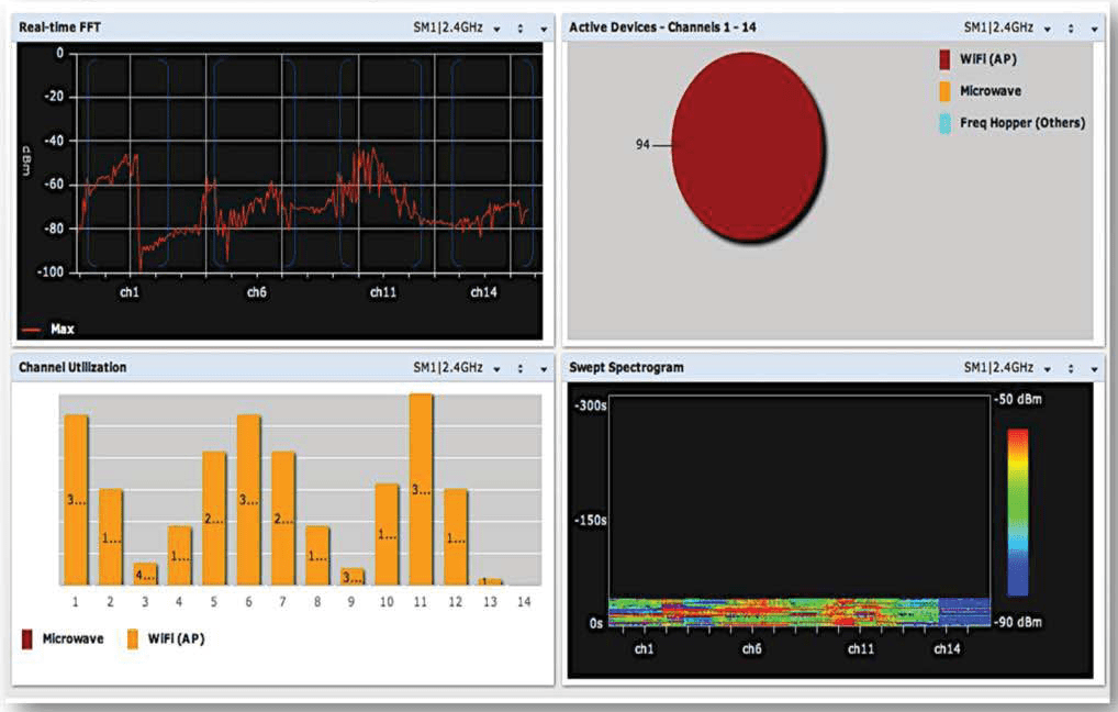 CCTV 카메라나 무선전화기, 타사의 AP, 전자레인지, 블루투스와 같은 주파수 호핑(Frequency Hopping) 장비는 무선랜 간섭의 가장 일반적인 원인입니다. 스펙트럼 분석기(Spectrum Analyzer)는 잠재적인 간섭 원인을 식별하고 찾는데 아주 효과적인 도구입니다.