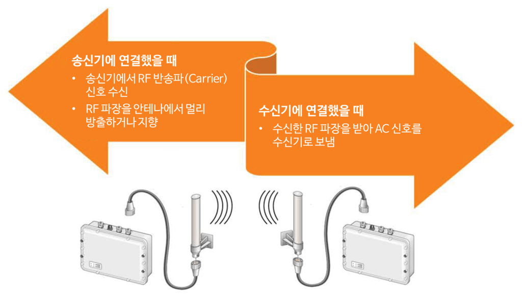 장치가 데이터를 전송할 때 안테나는 송신기에서 진동하는 캐리어 신호(Oscillating Carrier Signal)를 수신하고, 안테나에서 RF 파동을 방사하거나 지향성으로 보냅니다. 장치가 데이터를 수신할 때 안테나는 RF 신호를 수신하고 진동하는 캐리어 신호(Oscillating Carrier Signal)를 수신기로 보냅니다.
