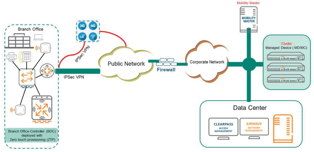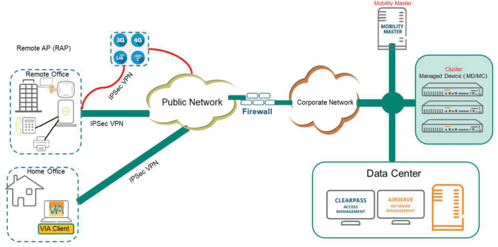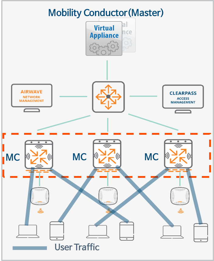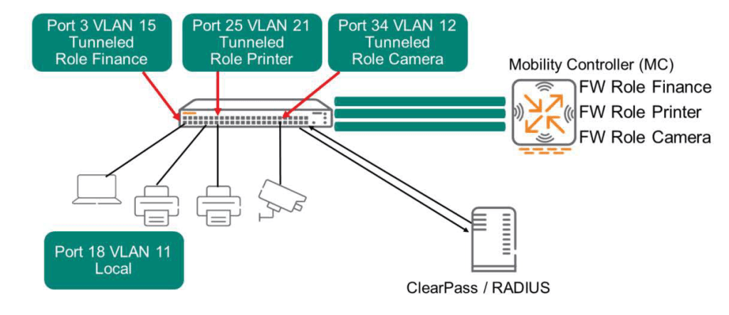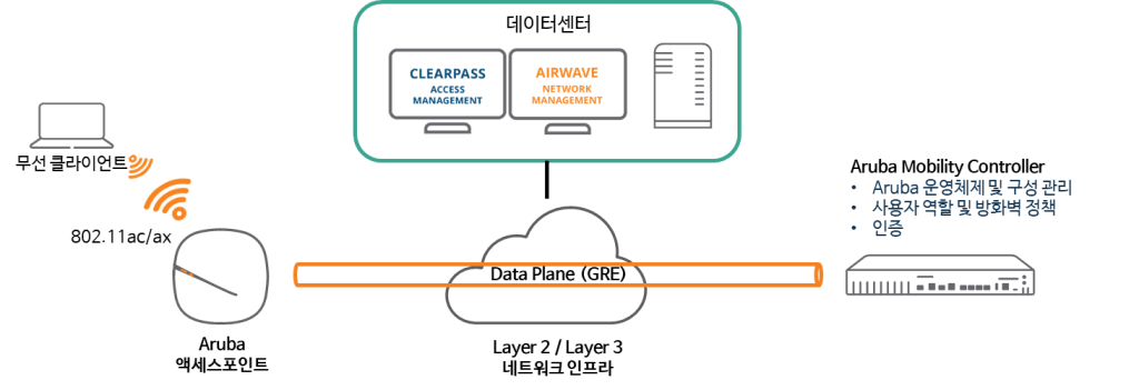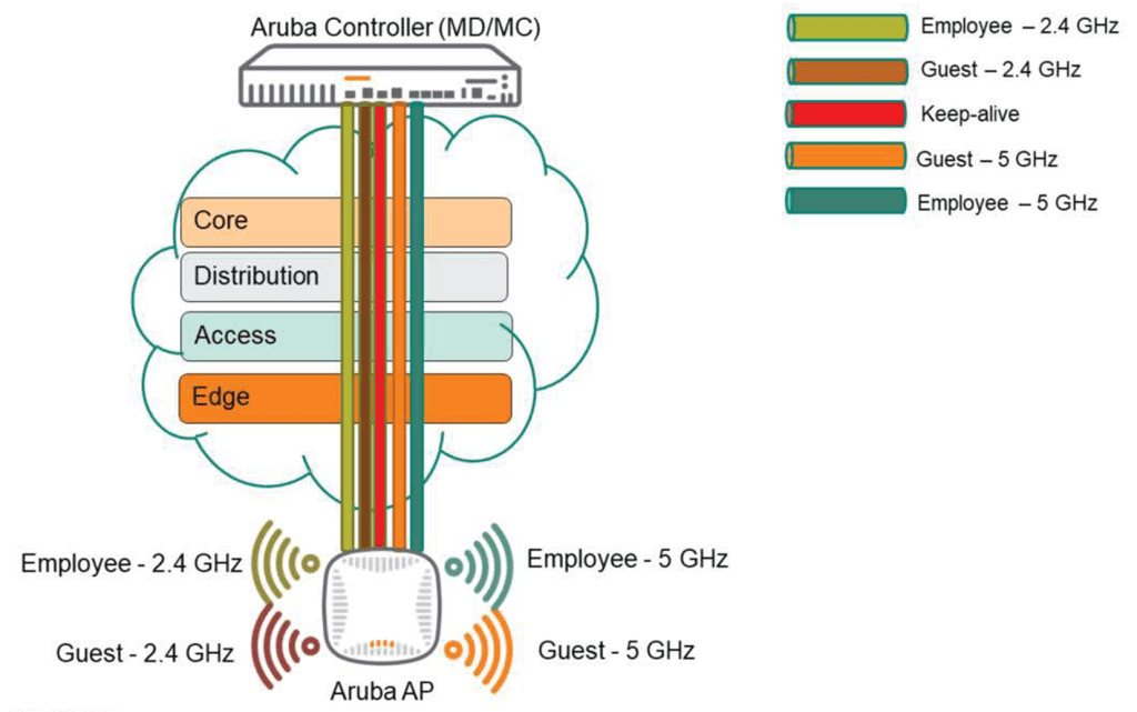 이 솔루션은 단말 트래픽을 로컬 스위치에 있는 VLAN을 통해 전통적인 방식으로 트래픽을 분리하거나, Aruba Mobility Controller로 터널링하여 트래픽을 보내는 기능을 제공합니다.