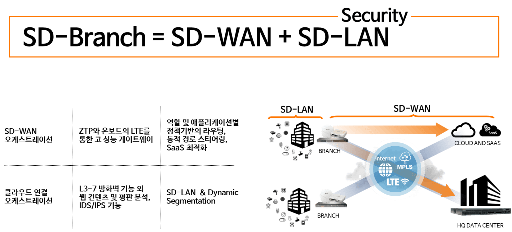 SD-Branch를 통해서 DSL 등의 브로드밴드(광대역망) 인터넷 연결이나 MPLS와 같은 다양한 WAN 업 링크 종류를 사용하여 SD-WAN 환경을 구성할 수 있습니다.