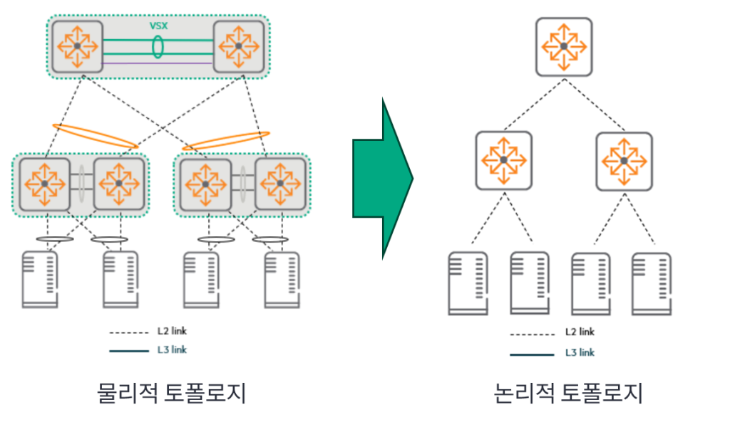 통합 코어 L2 토폴로지에서 VSX(Virtual Switching eXtension)와 LAG(Link Aggregation Group) 기술이 이 복잡성을 단순화하는 핵심 역할을 합니다.