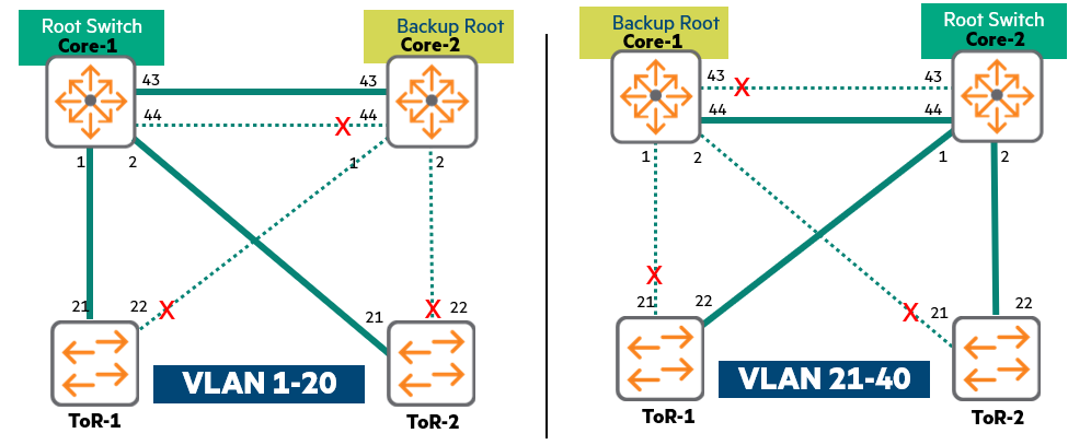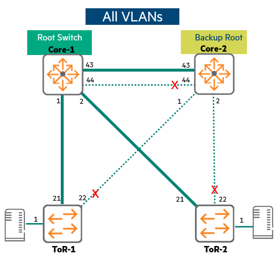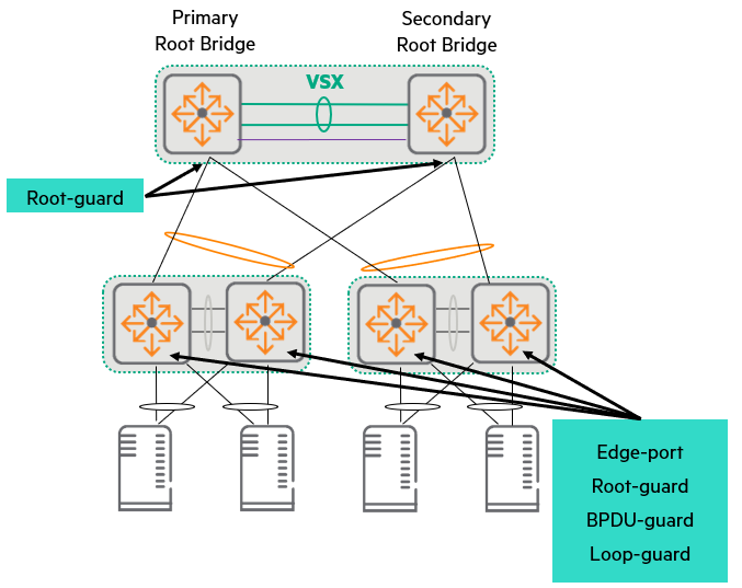 VSX와 LAG 덕분에 네트워크가 단순해졌지만, 스패닝 트리 프로토콜(STP), 루프 보호(Loop-protect) 기술은 여전히 필요합니다.