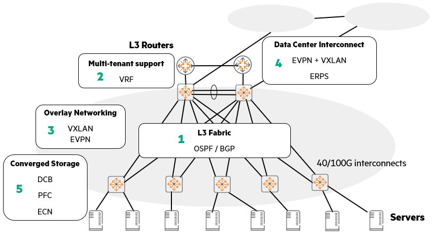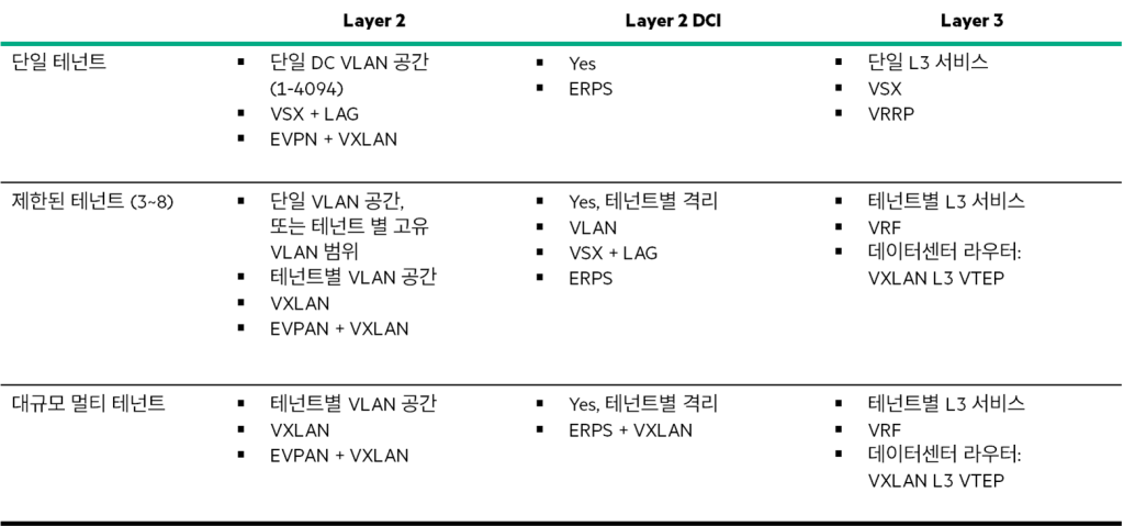 - 데이터센터 간 확장 가능한 Layer 2(L2) 연결: VM웨어의 vMotion과 같은 기술을 통해 가상 머신(VM)을 다른 물리 호스트로 이동시키는 등 모든 고객 요구사항을 충족시킬 수 있도록 데이터센터 네트워크가 L2 연결을 확장 가능하게 제공해야 합니다.