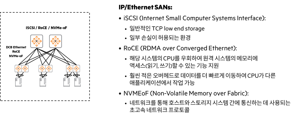 - 스토리지 프로토콜: NFS, iSCSI, FC, 그리고 NVMeoF(NVMe over Fabrics)와 같은 신기술이 있습니다.