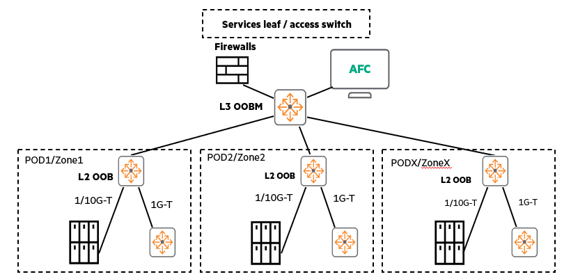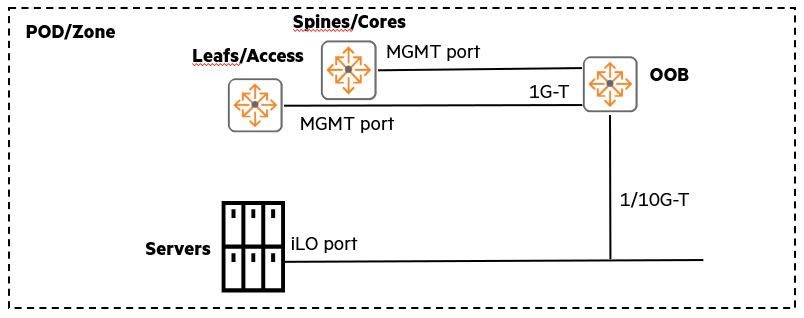 여러 개의 POD(데이터센터 내 모듈)를 사용하는 경우, 이러한 OOBM 네트워크는 L2 영역이 L3 코어 OOB 스위치까지 확장되는 스타 토폴로지처럼 커질 수 있습니다. (원한다면 고가용성(HA)을 위해 VSX나 VSF를 추가할 수도 있습니다.)