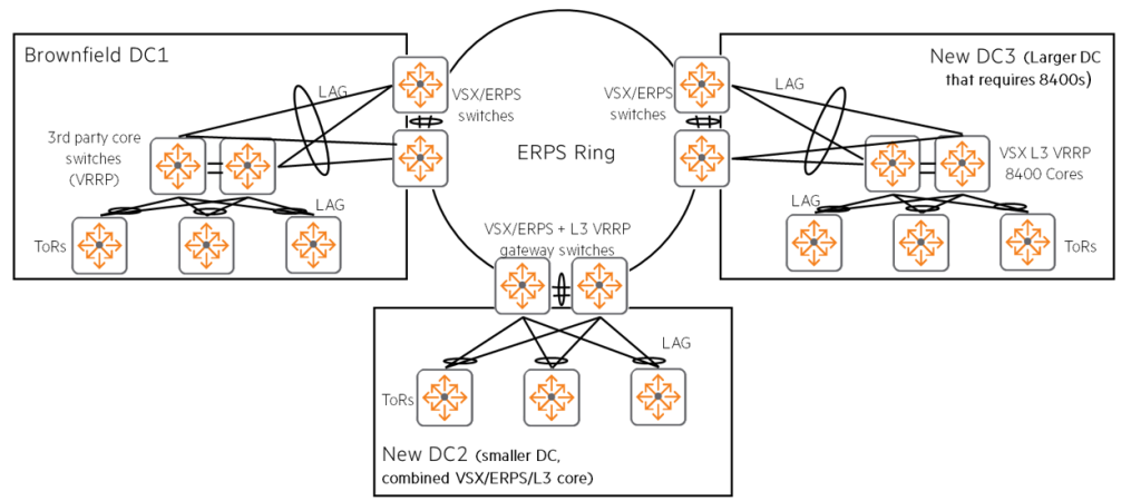 예를 들어, 이 솔루션은 다크 파이버5 연결을 통해 타사 스위치를 지원하는 Brownfield(기존 인프라) DC1, VSX/ERPS/VRRP 스위치가 결합된 소규모 DC2, 그리고 CX 8400 코어가 필요한 대규모 DC3과 같은 데이터센터에 적합합니다.