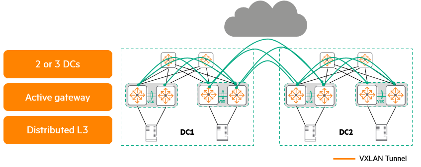 이러한 배포를 위해 HPE는 액티브 게이트웨이(Anycast)를 사용하여 데이터센터 간에 분산 게이트웨이를 사용할 것을 권장하며, 데이터센터 간에는 iBGP를 사용해야 합니다. 최적의 방법으로는 고가용성을 제공하기 위해 VSX 쌍을 사용하고, 불필요한 데이터가 WAN 링크를 통과하는 것을 방지하기 위해 ARP/ND 억제(suppression)를 사용하는 것이 좋습니다. WAN 링크는 지연 시간을 추가하고 대역폭 및 MTU가 낮을 수 있다는 점을 유의해야 합니다.