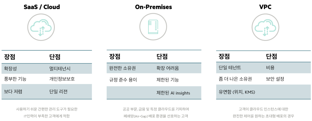 온프레미스 옵션은 인터넷 접속이 불가능한 고객, 예를 들어 군사 시설이나 은행과 같이 보안 수준이 매우 높은 산업을 위해 제공됩니다.