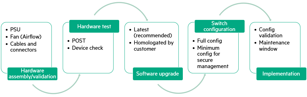 스위치 스테이징, 또는 사전 프로비저닝(pre-provisioning)이라고도 불리는 이 과정은 스위치를 데이터센터에 설치하기 전에 미리 포장을 풀고, 테스트하고, 소프트웨어를 업그레이드하고, 설정을 완료하는 작업을 말합니다.
