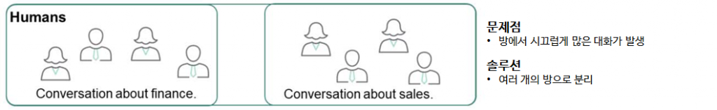 방 안에 두 명이 있을 때와 8명, 10명, 50명이 있을 때와 비교해볼까요? 당연히 두 명이 있을 때 대화가 빠르고 쉽고 효율적입니다. 사람이 많아질수록 여러 대화가 발생하면서 산만해지고 “충돌(Collison)”이 발생할 가능성이 높아집니다. 서로의 커뮤니케이션을 개선하고 사람들이 너무 오래 기다리지 않도록 다른 방으로 분리할 수 있습니다.