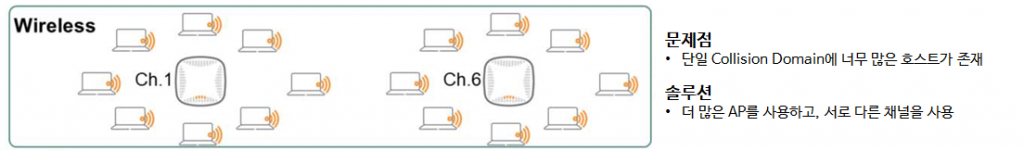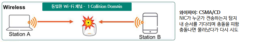 동일한 무선 액세스포인트(AP) 채널에 연결된 모든 기기는 동일한 충돌 도메인(Collision Domain)에 있기 때문에 한 번에 하나만 전송할 수 있게 됩니다.