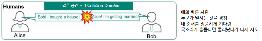 두 장치가 동시에 전송하면 전기신호가 충돌하게 되어 손상됩니다. 이것을 “Collision“이라고 얘기합니다.