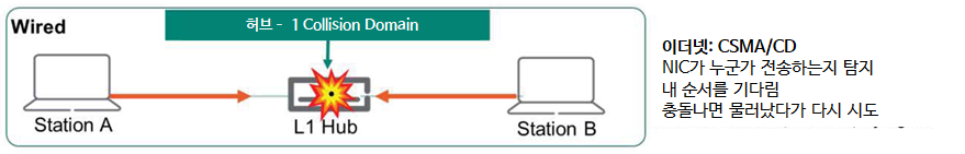16포트 허브에 연결된 모든 16개 장치는 동일한 Collision Domain에 위치합니다. 한 장치가 전송하면 나머지 15개의 다른 장치들은 모두 대기해야 합니다. 만약 두 개의 호스트가 동시에 전송하면 충돌(Collision)이 발생하게 되고, 모두가 물러나고 몇 밀리초(ms)동안 대기했다가 다시 시도하게 됩니다.