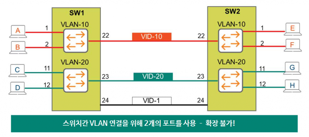 만약.. VLAN이 10개 있다면? VLAN이 100개가 있다면? 두 스위치간 상호연결을 위해서 VLAN 개수 만큼의 물리적 연결이 필요해지게 됩니다. 불필요한 포트 낭비일뿐만 아니라 사실상 불가능합니다.