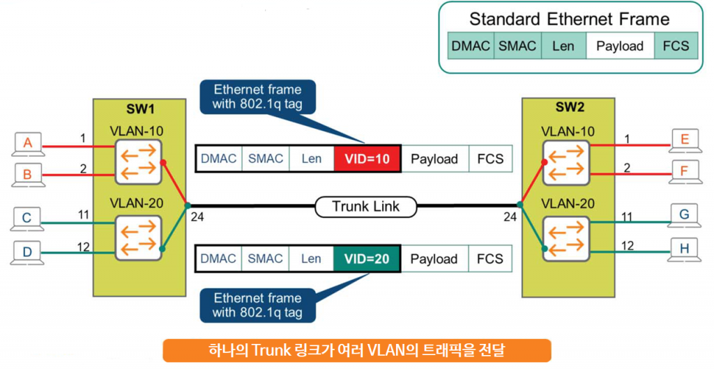 Host A의 브로드캐스트 프레임으로 24번 포트를 포함하여 VLAN 10이 할당된 모든 포트로 플러딩되어 나갔다고 생각해보겠습니다. 이 프레임에는 수신하는 스위치가 어떤 VLAN인지 알수 있는 필드가 없습니다. 따라서, SW2 스위치는 이 프레임을 받는 순간, 이 브로드캐스트 프레임이 VLAN 10인지, VLAN 20인지, 아니면 VLAN 1의 프레임인지 알 수가 없습니다.
