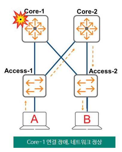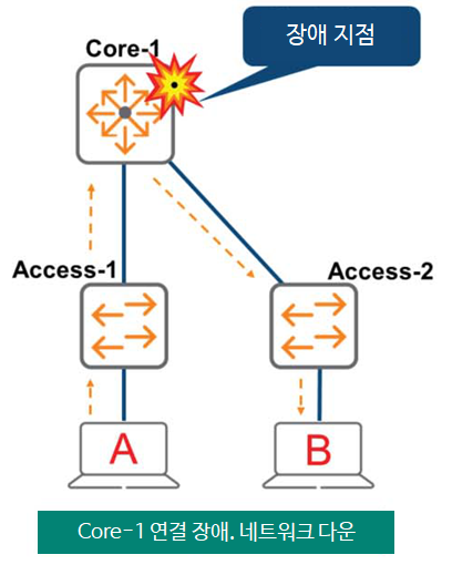 아래와 같이 Core-1 스위치로 연결되는 경로가 하나밖에 없다면 두 개의 액세스 스위치 중 Core-1 스위치와 연결된 링크가 끊어진다면 네트워크가 단절되고, 결국 Host A와 Host B는 서로 통신할 수가 없게 됩니다.