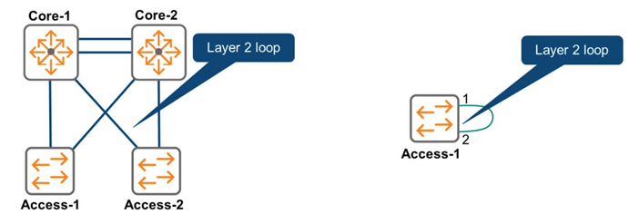 링크 이중화 구성으로 Layer 2 스위치를 연결하면 Layer 2 Loop(루프)가 생성됩니다. 또한, 스위치의 한 포트에서 동일한 스위치 다른 포트로 케이블을 연결하는 경우에도 루프가 생성됩니다.