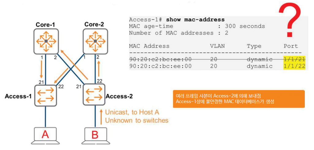 Access-1 스위치 입장에서는 Port 21이나 Port 22를 통해 Host B와 통신할 수 있다고 생각하게 됩니다. 마치 두 곳에 있는 것처럼 보이기 때문에 혼란스러울 수밖에 없습니다. 하지만 Host B는 한 곳에만 존재하고 있습니다. 결국, Access-2에서 생성된 다중의 프레임 복사본은 Access-1의 MAC주소 데이터베이스를 불안정하게 만들게 됩니다.
