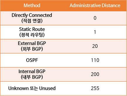 아래 표는 각 라우팅 프로토콜에 대한 Administrative Distances(관리 거리)를 보여줍니다.
