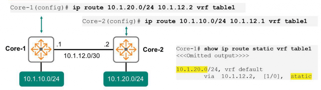 Core-1(config)# ip route 10.1.20.0/24 10.1.12.2 vrf table1