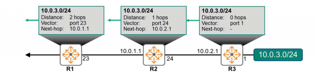 R1은 목적지 10.0.3.0/24 네트워크에 도달하기 위해서는 목적지와 1 홉 떨어져 있는 R2로 통해 가야 하고, 그럼 자신(R1)과는 2 홉 떨어져 있게 된다는 사실을 알게 됩니다. 또한 2 홉 떨어져 있는 목적지 네트워크로 가기 위해서는 R1는 로컬 포트 24번에서 10.0.1.1로 패킷을 전달해야 한다는 것도 인지하게 됩니다.