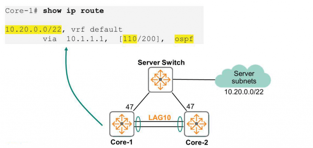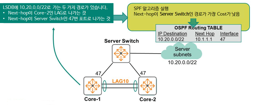 예를 들어, Core-1 스위치의 SPF 알고리즘은 토폴로지 데이터베이스를 분석해서 목적지 10.20.0.0/22로 가는 방법이 ① LAG10에서 패킷을 라우팅하여 Core-2를 통해 가거나, ② 포트 47번으로 나가서 Server Switch를 통해 갈 수 있다는 것을 확인합니다.