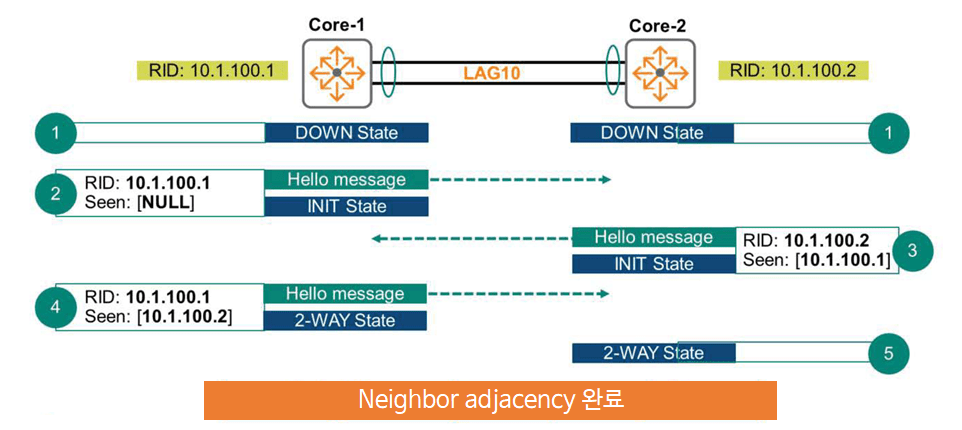 - 1단계: 이웃 테이블(Neighbor Table) 구축 – 각 OSPF 라우터는 OSPF 이웃과의 관계를 설정합니다.