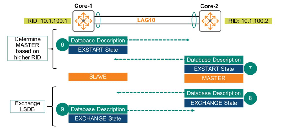 7. Core-2 스위치는 유사한 프로세스를 수행합니다. Database Description 패킷을 보내서 EXSTART 상태로 전환합니다. EXSTART 상태의 목적은 가장 높은 Router ID를 기반으로 링크의 MASTER가 될 스위치를 결정하는 것입니다. MASTER의 역할은 데이터베이스 교환 프로세스를 시작할 스위치를 정하는 것입니다. 이 역할은 DR/BDR과 아무 관련이 없고 LSDB(Link-State Database) 교환 전용입니다.