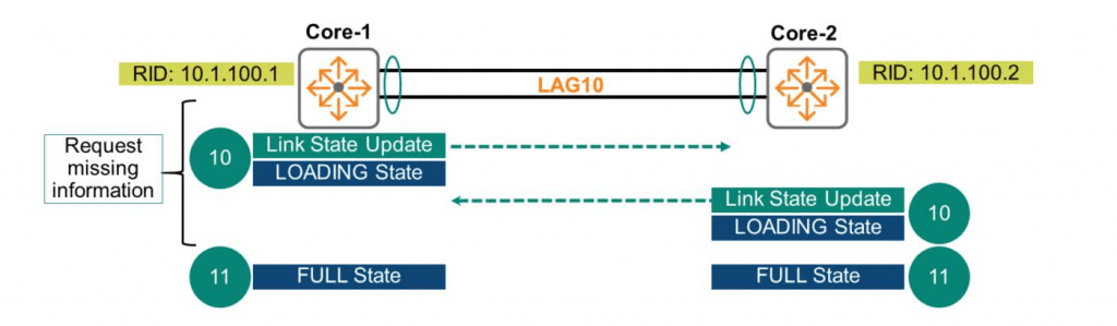 10. Core-1 스위치와 Core-2 스위치는 LSU(Link State Update) 패킷을 사용하여 누락된 정보를 요청합니다. 요청을 받은 피어는 요청된 데이터베이스 정보를 전송하여 응답합니다. 두 스위치 모두 LOADING 상태로 전환합니다.