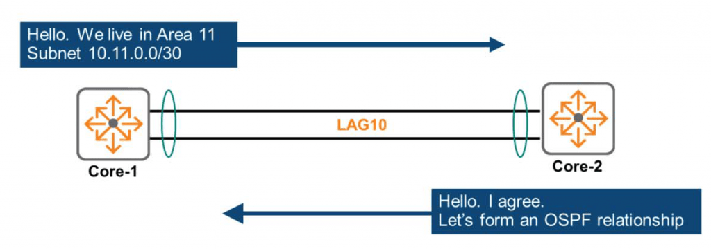 예를 들어, 위 그림과 같이 Core-1 스위치는 서브넷 10.11.0.0/30의 LAG10을 포함한 OSPF가 활성화된 모든 인터페이스에 Hello 패킷을 보내게 됩니다.