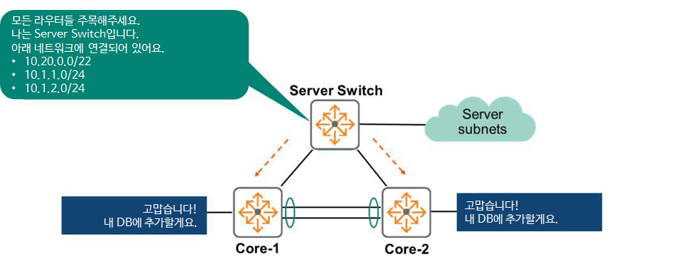 위 예제의 그림은 Server Switch가 현재 알고 있는 네트워크의 전부이기 때문에 직접 연결되어 있는 Server Subnet 정보만 광고하게 됩니다. 그러나 Server Switch가 다른 라우터로부터 LSA를 수신하면 그 경로도 함께 알려주게 됩니다.
