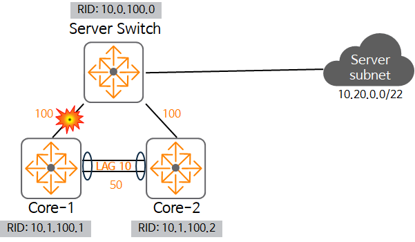 그림처럼 Core-1과 Server Switch간 링크에 장애가 발생하면, Server Switch와 Core-1은 이 장애를 감지합니다.