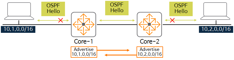 그림에서 Core-1은 Hello 패킷을 10.1.0.0/16 네트워크로 보내지 않지만, Core-2에는 알립니다. Core-2 역시 10.2.0.0/16 네트워크에 대해서 Core-1에게만 알립니다.