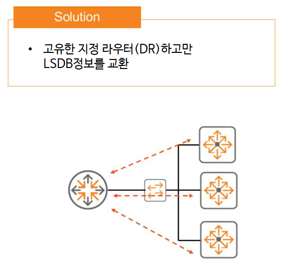 이러한 문제의 해결책은 브로드캐스트 도메인 안에서 피어간 상호 작용을 조정하는데 도움이 되는 단일 접점 포인트인 지정 라우터(DR)를 선택하는 것입니다. 브로드캐스트 도메인의 다른 모든 OSPF 피어와 완전한 인접성 (full adjacency)을 형성해서 LSA를 수신하고 플러딩 할 수 있게 됩니다.