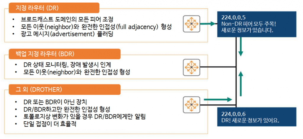 브로드캐스트 도메인에 3개의 라우터가 있든 30개의 라우터가 있든 상관없이 DROTHER 라우터는 DR과 BDR, 2개의 피어하고만 인접성(adjacency)을 형성하면 됩니다.