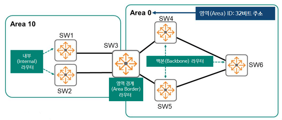 OSPF에서 영역(Area)이란 동일한 링크 상태 데이터베이스(LSDB)를 공유하는 OSPF 라우터 그룹을 말합니다.