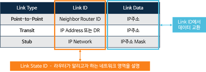 Link Type은 주로 OSPF 라우터의 인터페이스 또는 이웃(Neighbor)를 설명하는데 사용됩니다.