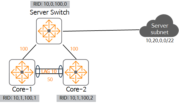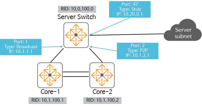 위 토폴로지 그림에서 Core-1 스위치는 해당 영역에 3개의 라우터가 있음을 알 수 있습니다. 이는 나중에 강력한 트러블슈팅 명령어로 사용될 수 있습니다.
