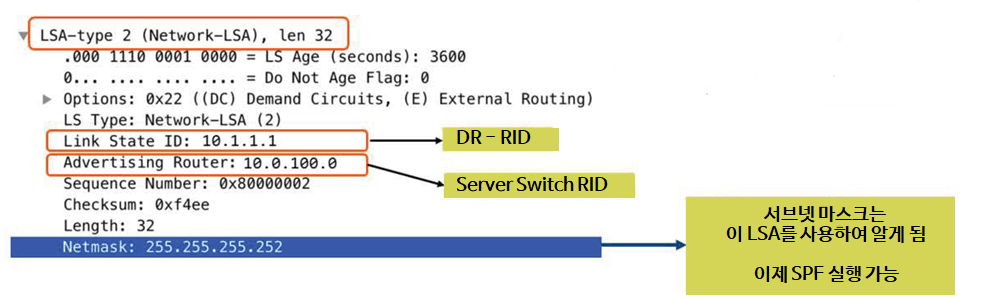 마지막으로 브로드캐스트 인터페이스에는 라우터 ID의 IP주소만 포함되지만, 이 경우에 LSA Type 1을 사용하여 서브넷 정보가 포함되지 않게 됩니다. 결국 SPF 알고리즘을 실행할 수가 없게 됩니다.